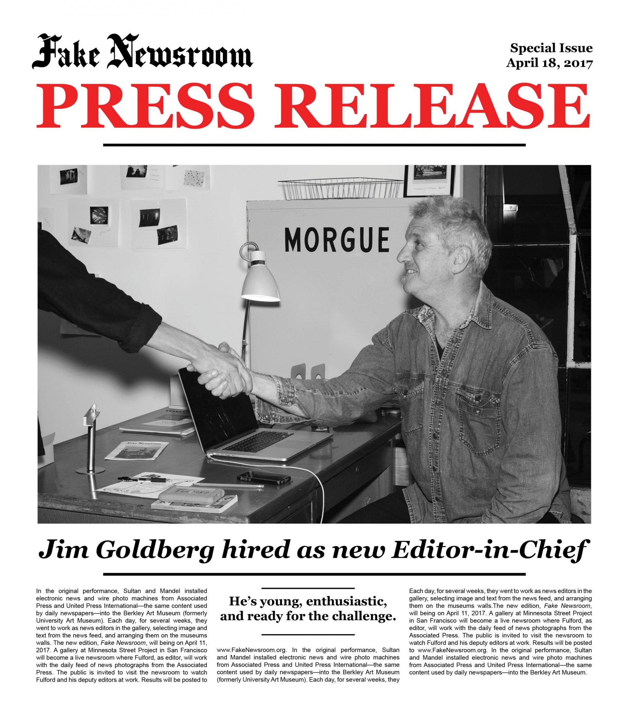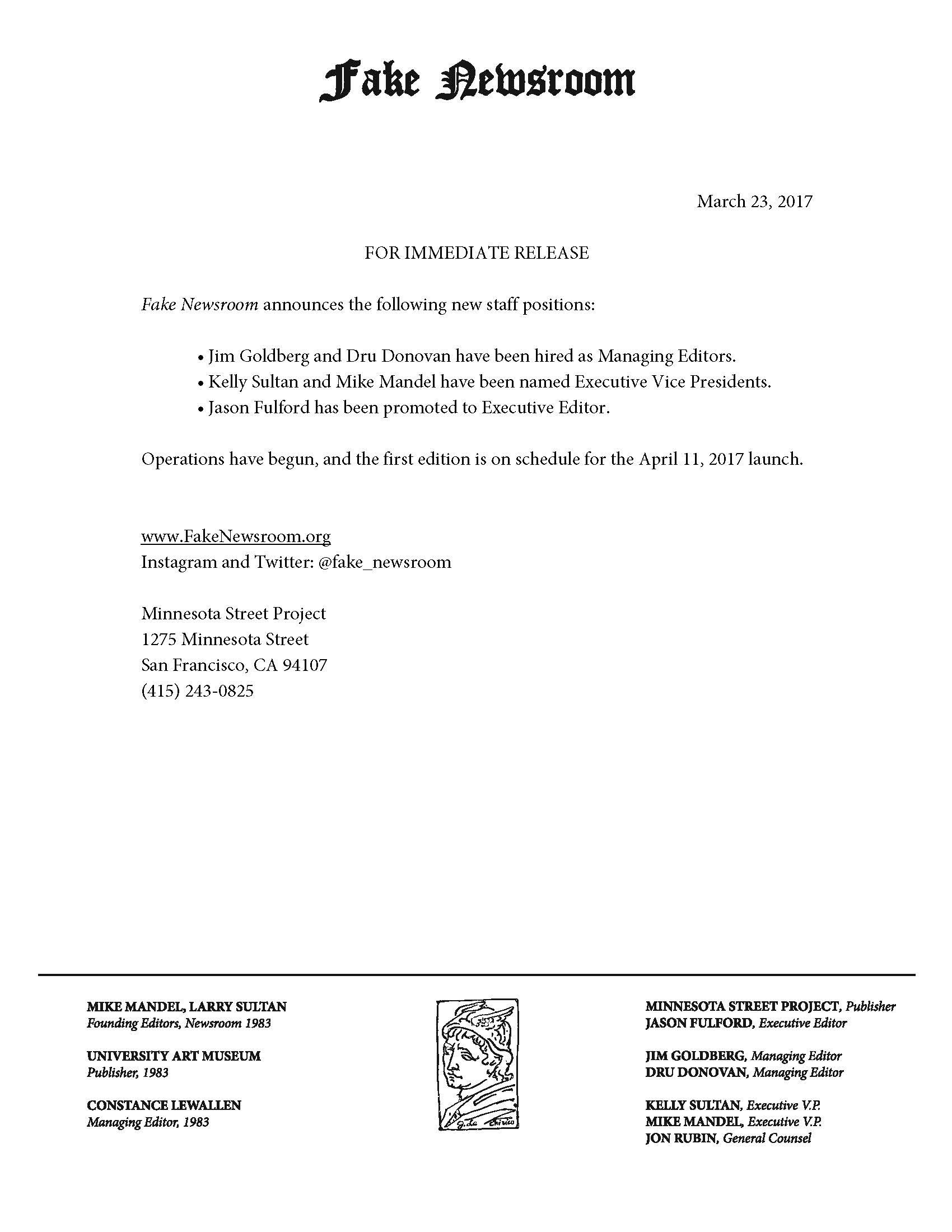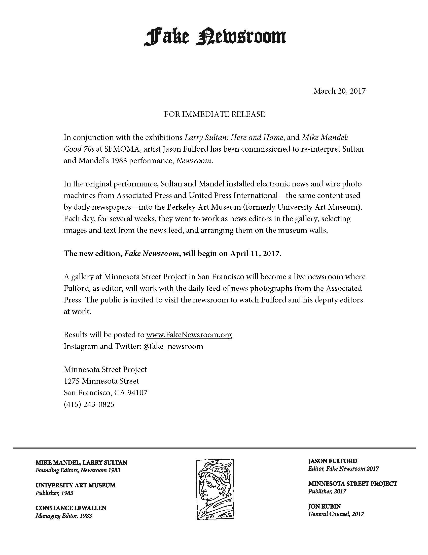 Following a similar structure to Newsroom (1983), this 2017 iteration, titled Fake Newsroom, will be active for three weeks at Minnesota Street Project, with Fulford, Goldberg and Donovan acting as editors of a working newsroom inside the gallery. Utilizing images from the Associated Press feed, the editors will create a daily edition posted at fakenewsroom.org and within the newsroom exhibition.