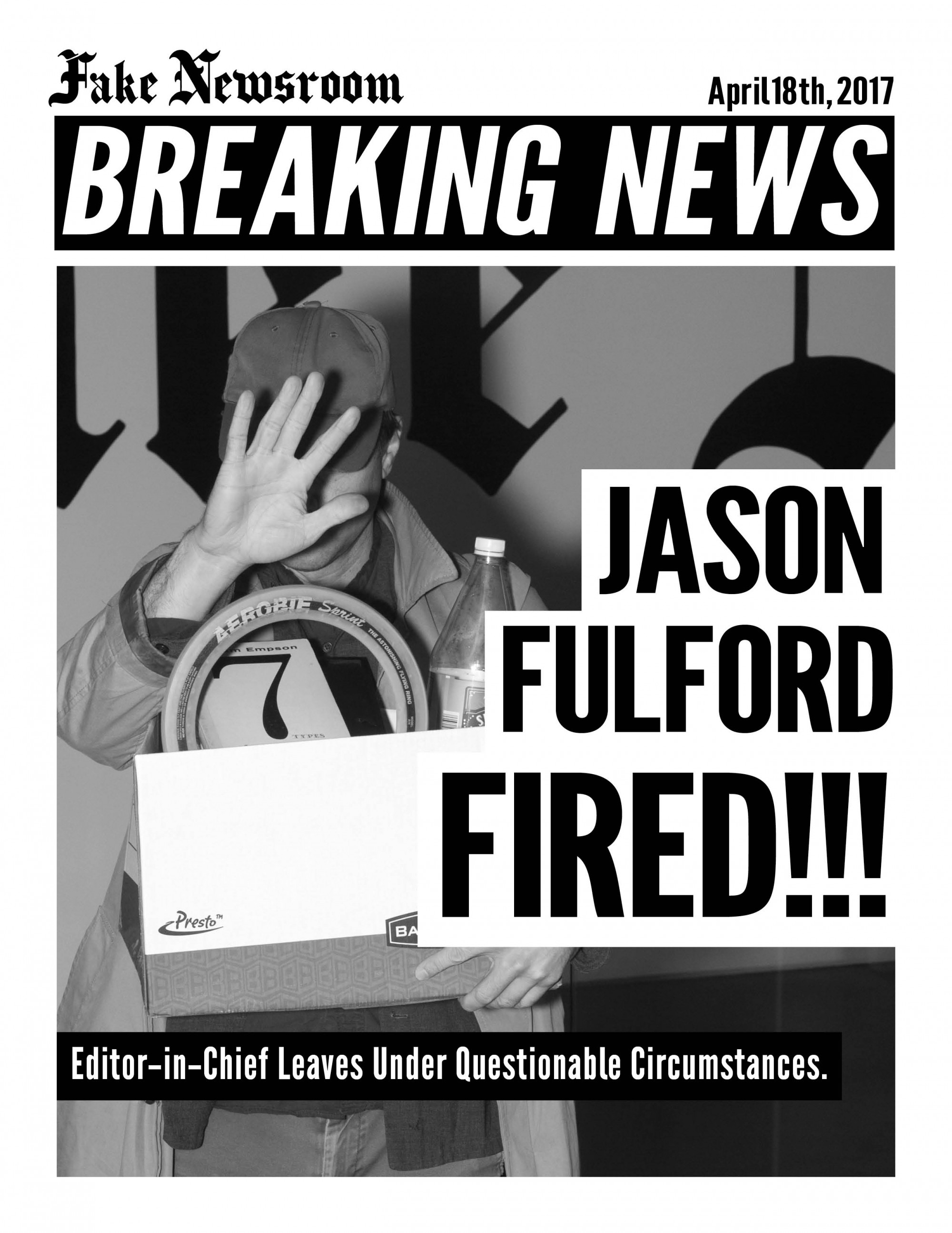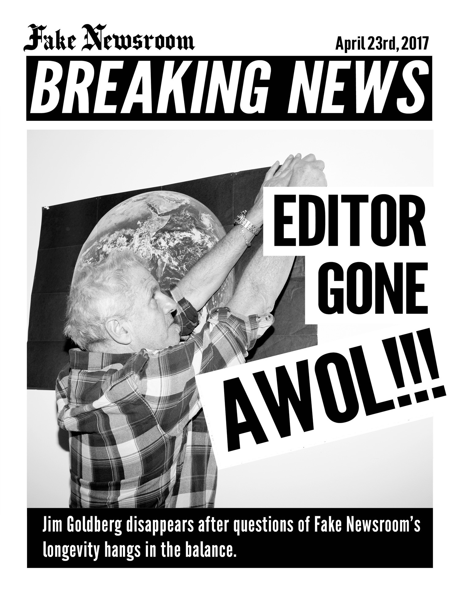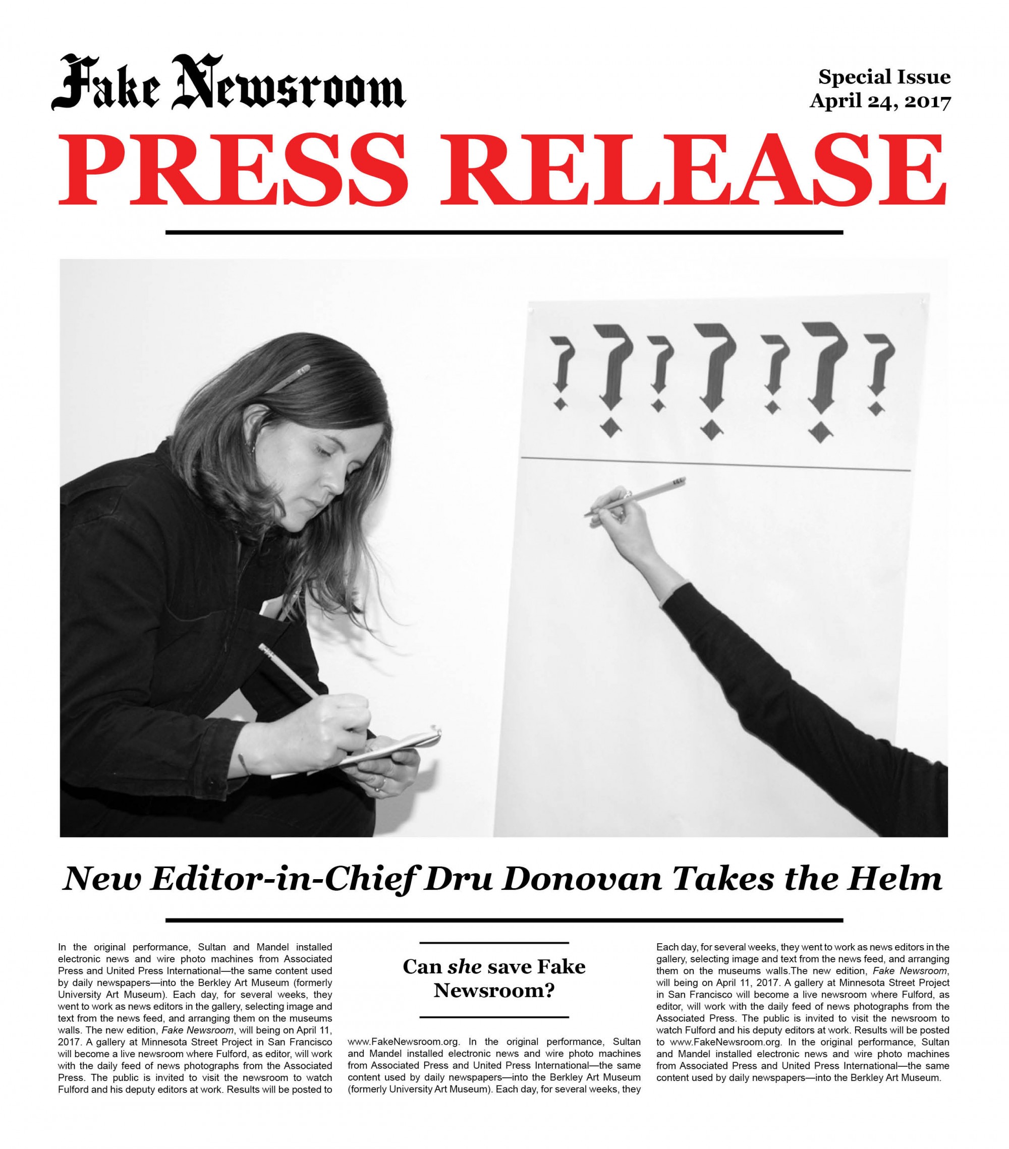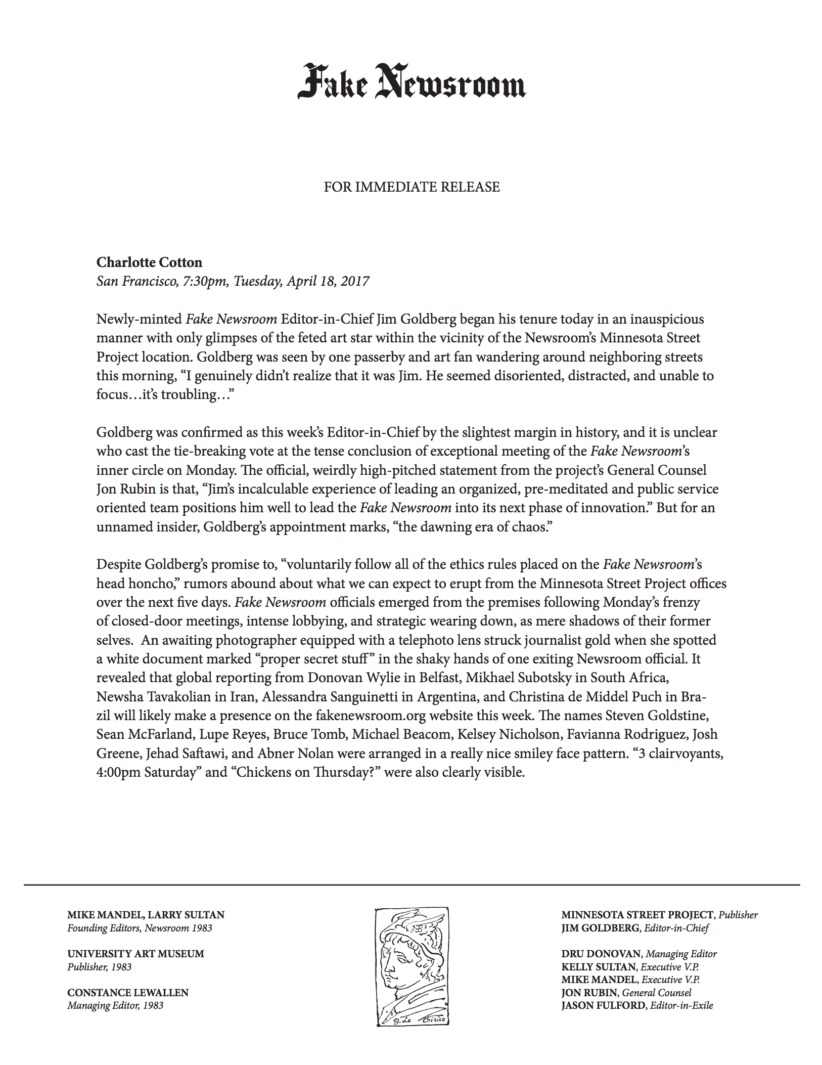 Following a similar structure to Newsroom (1983), this 2017 iteration, titled Fake Newsroom, will be active for three weeks at Minnesota Street Project, with Fulford, Goldberg and Donovan acting as editors of a working newsroom inside the gallery. Utilizing images from the Associated Press feed, the editors will create a daily edition posted at fakenewsroom.org and within the newsroom exhibition.