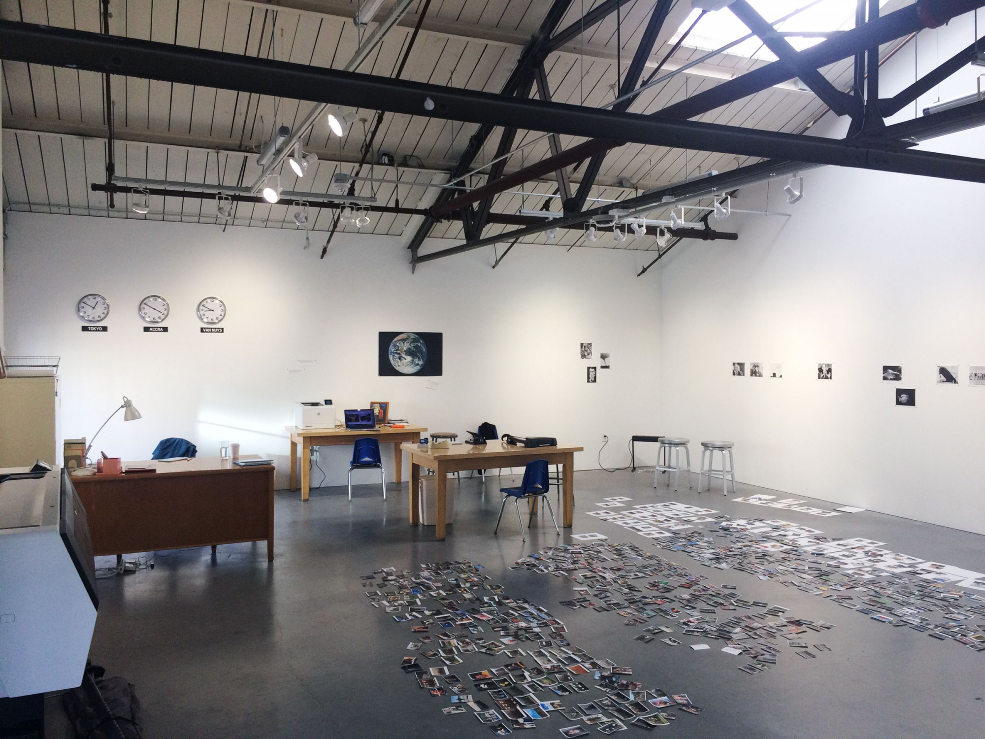 About the original Newsroom (1983): Larry Sultan and Mike Mandel took up residency at the Berkeley Art Museum for five weeks, recreating a version of a working newsroom as an evolving installation. AP and UPI machines were installed in the gallery and everyday the two artists went to work in the museum, editing the daily news and image feed. Trends and patterns were re-photographed and re-printed for weekly installations in the gallery. When removed from their original context, the subtexts and ambiguities of daily news feeds were illuminated in their evolving graphs, murals and installations.