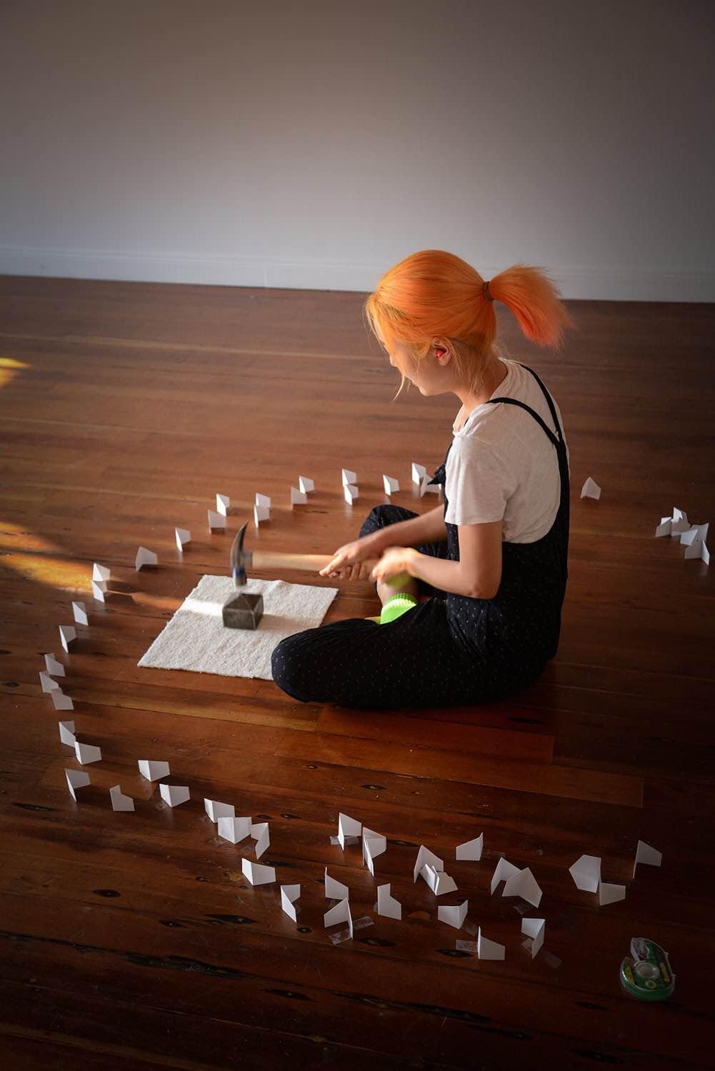 In the middle of the gallery Sohn will sit beside a three-inch tall abstracted steel house, striking the house 100 times with a metal hammer, while counting each strike aloud. Next to her, a stack of white paper is already cut to manifest as a self-standing house when folded in half. With every 100 strikes, Sohn will realize one paper house. The paper houses will slowly fill the gallery as the steel house loses its form. Through the repetitive nature of this work, Sohn will embody and process the forces that have influenced the way she lives, and also respond to these forces by acting out.